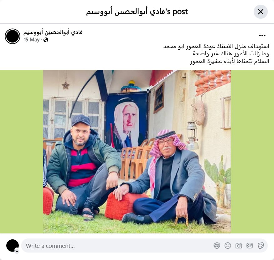 استهداف منزل الاستاذ عودة العمور ابو محمد وما زالت الأمور هناك غير واضحة السلام نتمناها لأبناء عشيرة العمور