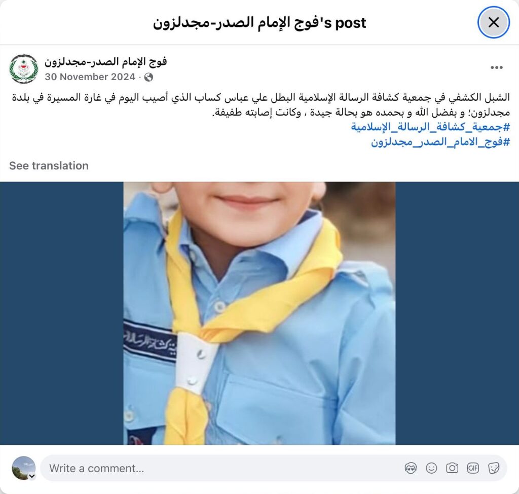 الشبل الكشفي في جمعية كشافة الرسالة الإسلامية البطل علي عباس كساب الذي أصيب اليوم في غارة المسيرة في بلدة مجدلزون؛ و بفضل الله و بحمده هو بحالة جيدة ، وكانت إصابته طفيفة.
