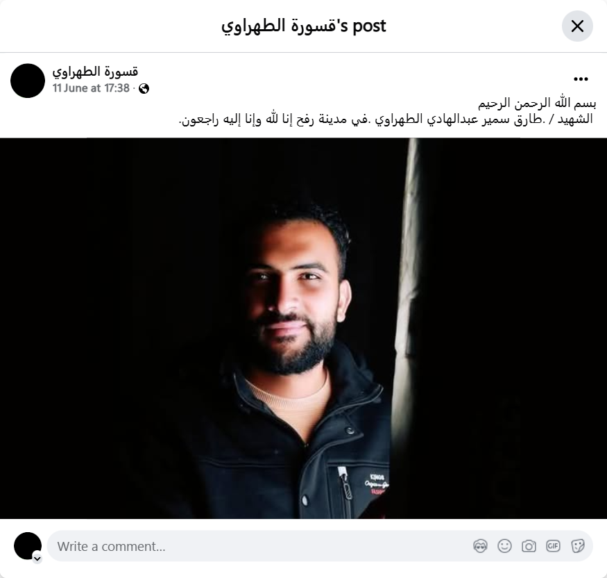 بسم الله الرحمن الرحيم الشهيد / .طارق سمير عبدالهادي الطهراوي .في مدينة رفح إنا لله وإنا إليه راجعون.