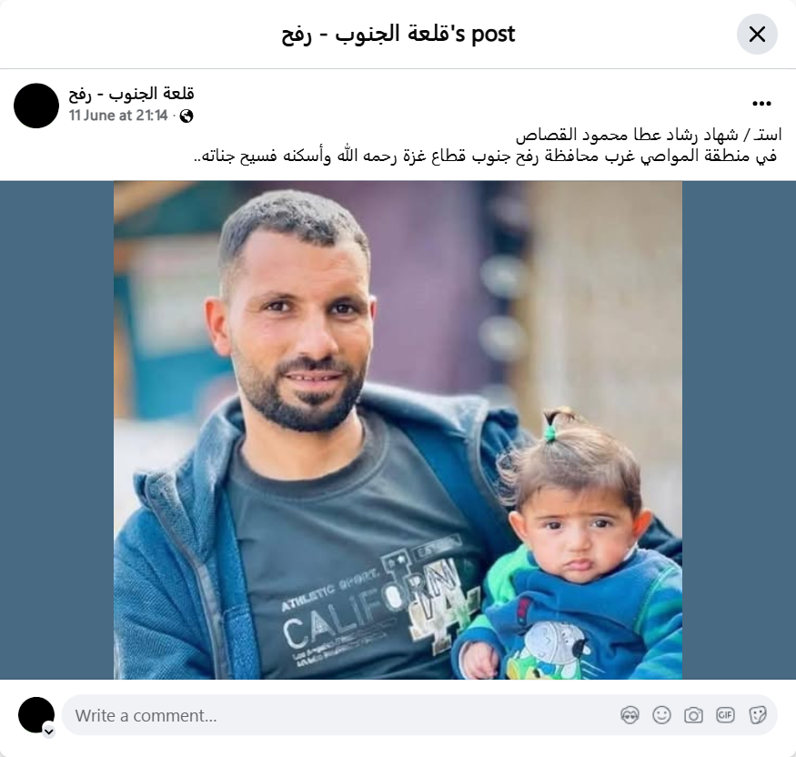 Martyrdom of Rashad Atta Mahmoud Al-Qassas in the Al-Mawasi area west of Rafah Governorate in the southern Gaza Strip. May God have mercy on him and grant him a place in His spacious gardens.