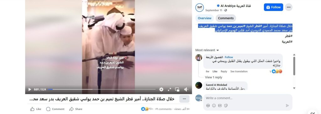 During the funeral prayer, the Emir of Qatar, Sheikh Tamim bin Hamad, offered his condolences to the brother of Corporal Badr Saad Mohammed Al-Humaidi Al-Dosari, one of the victims of the Israeli attack.