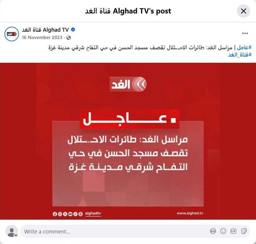 #Breaking | Al-Ghad correspondent: Israeli warplanes bomb Al-Hassan Mosque in the Al-Tuffah neighborhood, east of Gaza City. #AlGhadTV