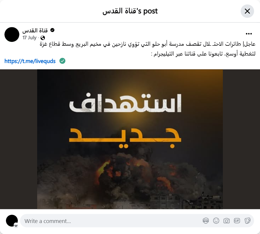 Urgent | Occupation aircraft bomb Abu Helou School, which houses displaced persons in Al-Bureij camp in the central Gaza Strip.