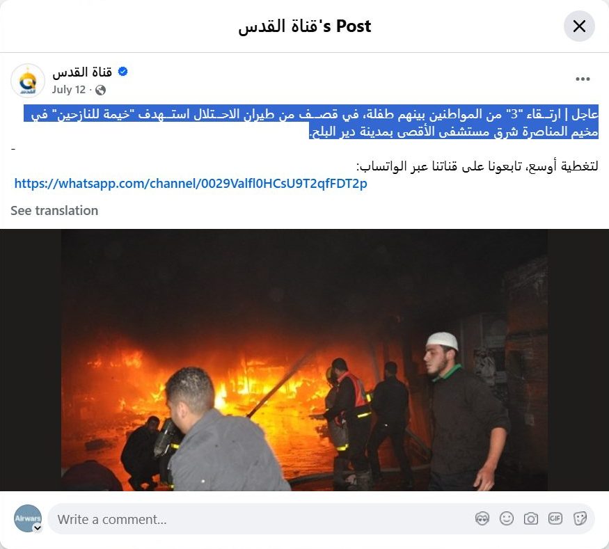 Urgent | Three citizens, including a child, were killed in an Israeli airstrike that targeted a tent for displaced people in the Al-Manasra camp, east of Al-Aqsa Hospital in Deir al-Balah.