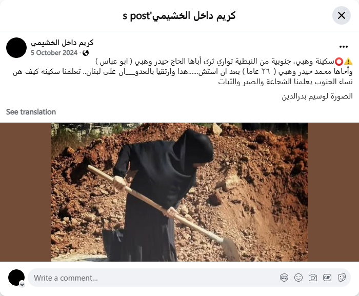 Sakina Wehbe, a southern woman from Nabatieh, buried her father Hajj Haidar Wehbe (Abu Abbas) and her brother Muhammad Haidar Wehbe (26 years old) after they were martyred and rose up with the enemy___on Lebanon