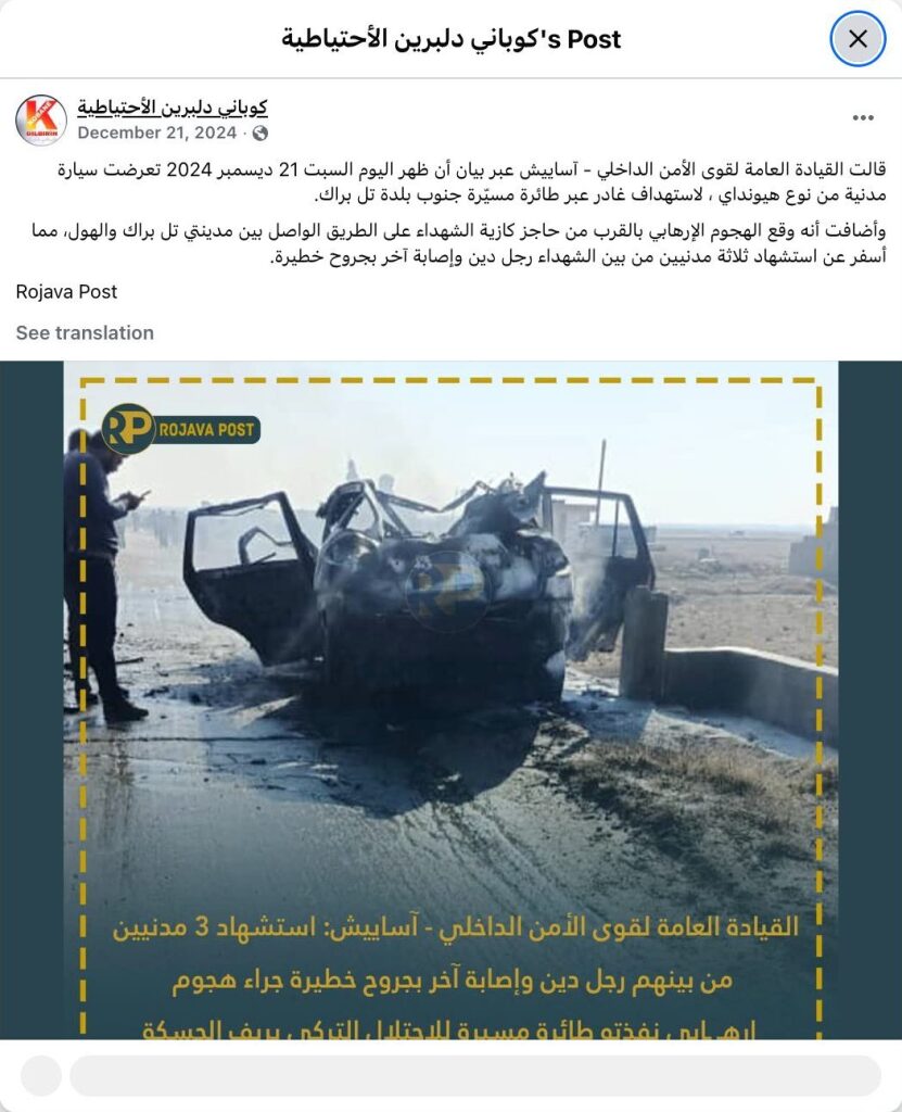 The General Command of the Internal Security Forces (Asayish) stated in a press release that on Saturday, December 21, 2024, a civilian Hyundai vehicle was targeted by a drone strike south of the town of Tel Brak.