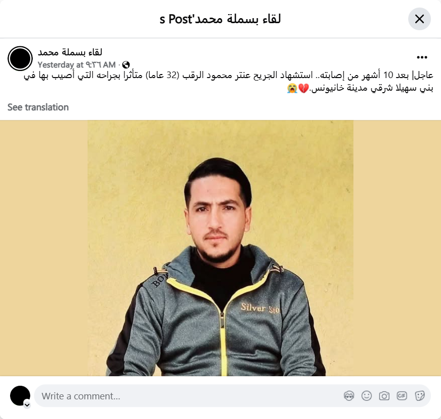 Urgent | Ten months after his injury, wounded Antar Mahmoud al-Raqab (32 years old) succumbed to his wounds in Bani Suhaila, east of Khan Yunis.