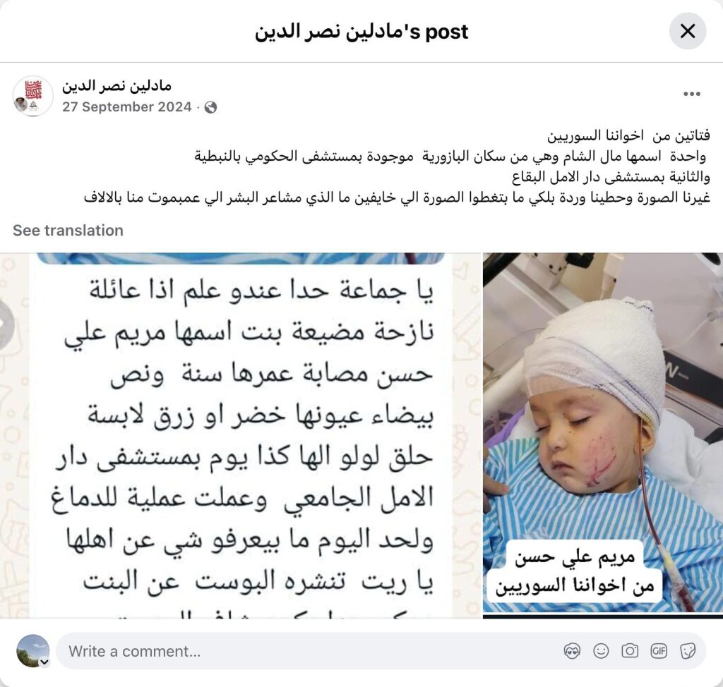 One named Mal Al-Sham, from Bazouriyeh, is in the government hospital in Nabatieh. The other is in Dar Al-Amal Hospital in the Bekaa Valley. We changed the picture and put a rose in case you cover up the image. What are you afraid of? What about the feelings of the people who are dying by the thousands?