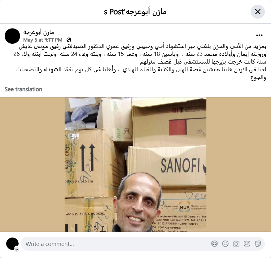 With great sorrow and sadness, I received the news of the martyrdom of my brother, my love, and my lifelong companion, the pharmacist Rafiq Musa Ayesh, his wife Iman, and his sons Muhammad, 23 years old, Yassin, 18 years old, and Omar, 15 years old, and his daughter Wafaa, 24 years old. His daughter Walaa, 26 years old, survived and had gone out with her husband to the hospital before their home was bombed. We in Jordan have continued to live with the story of nonsense, lies, and the Indian movie, while our people lose martyrs, sacrifices, and hunger every day.