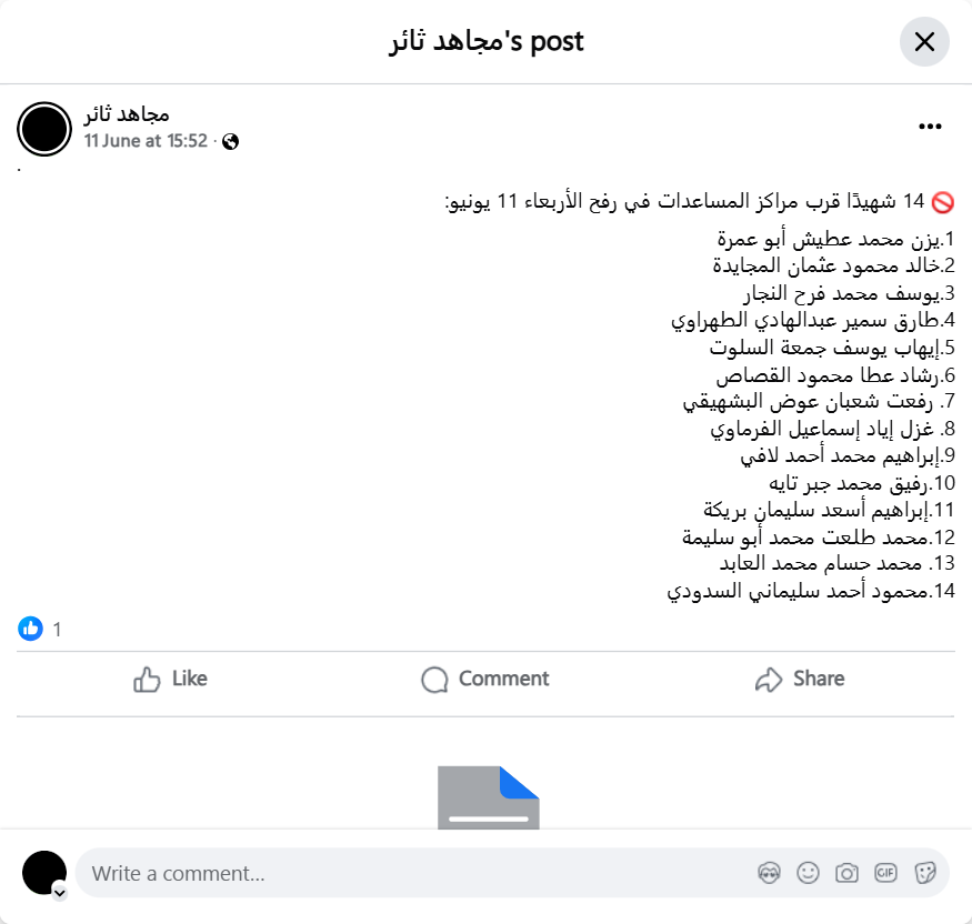 14 martyrs near aid centers in Rafah, Wednesday, June 11: 1. Yazan Muhammad Atish Abu Amra 2. Khaled Mahmoud Othman Al-Majayda 3. Youssef Muhammad Farah Al-Najjar 4. Tariq Samir Abdel Hadi Al-Tahrawi 5. Ihab Youssef Jumaa Al-Salut 6. Rashad Atta Mahmoud Al-Qassas 7. Refaat Shaaban Awad Al-Bashhiqi 8. Ghazal Iyad Ismail Al-Farmawi 9. Ibrahim Muhammad Ahmed Lafi 10. Rafiq Muhammad Jabr Tayeh 11. Ibrahim Asaad Suleiman Brika 12. Muhammad Talat Muhammad Abu Sulayma 13. Muhammad Hussam Muhammad Al-Abed 14. Mahmoud Ahmed Sulaymani Al-Sadoudi
