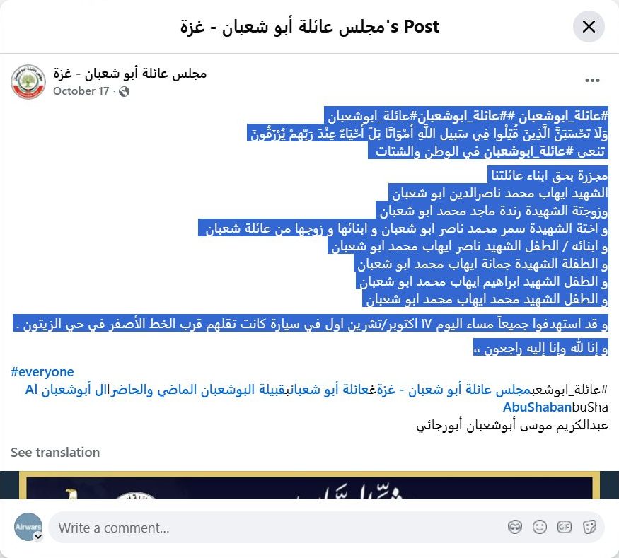 The Abu Shaaban family, both at home and abroad, mourns the massacre perpetrated against our family members: