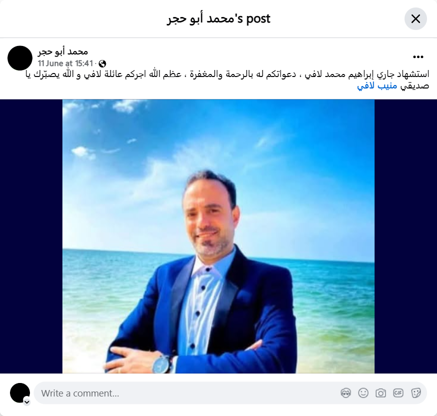 استشهاد جاري إبراهيم محمد لافي ، دعواتكم له بالرحمة والمغفرة ، عظم الله اجركم عائلة لافي و الله يصبّرك يا صديقي منيب لافي