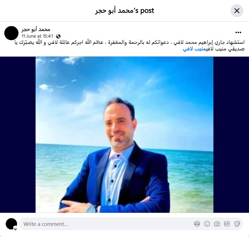 The martyrdom of my neighbor Ibrahim Muhammad Lafi, please pray for him to have mercy and forgiveness. May God reward you, Lafi family, and may God give you patience, my friend, Munib Lafi. Munib Lafi.