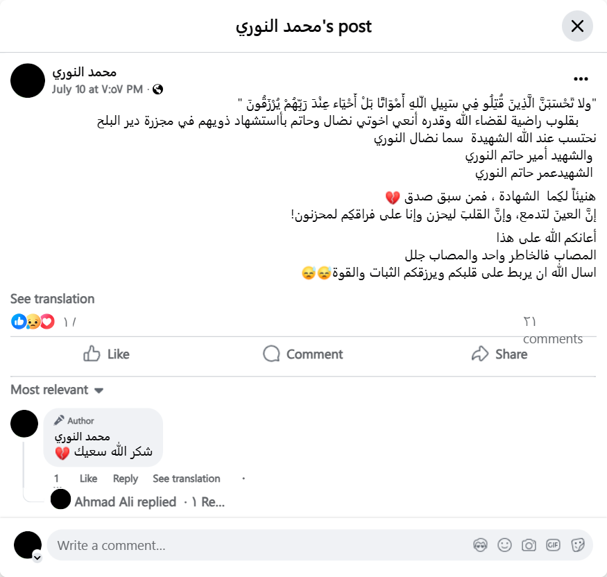 With hearts content with God's will and destiny, I mourn my brothers Nidal and Hatem for the martyrdom of their relatives in the Deir al-Balah massacre.