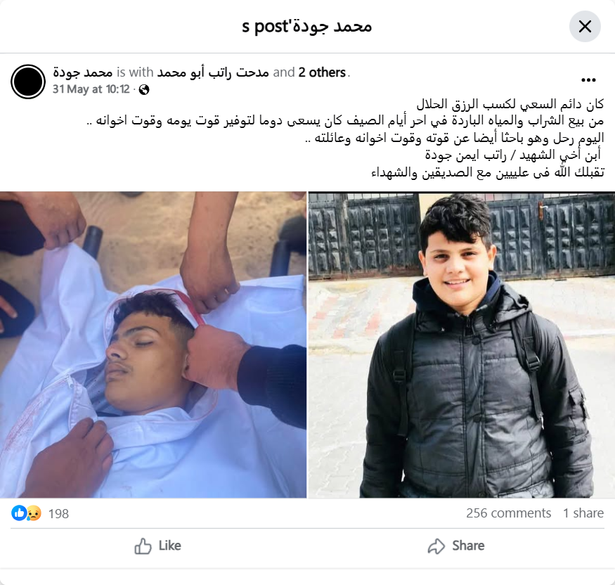He was always striving to earn a lawful living by selling drinks and cold water in the hottest days of summer. He was always striving to provide for himself and his brothers. Today he departed while also searching for his own sustenance and the sustenance of his brothers and family. My nephew, the martyr / Rateb Ayman Joda. May God accept you in the highest heavens with the righteous and the martyrs.