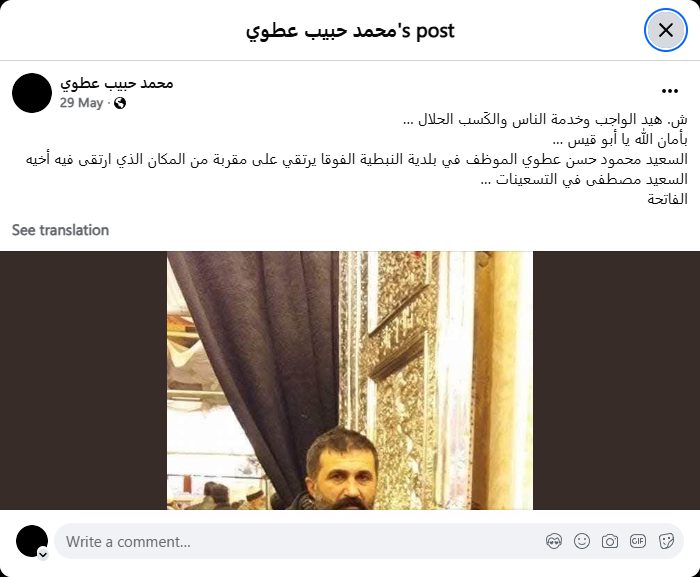 The honorable Mahmoud Hassan Atwi, an employee in the Nabatieh al-Fawqa municipality, passed away near the spot where his brother, the honorable Mustafa, passed away in the 1990s...