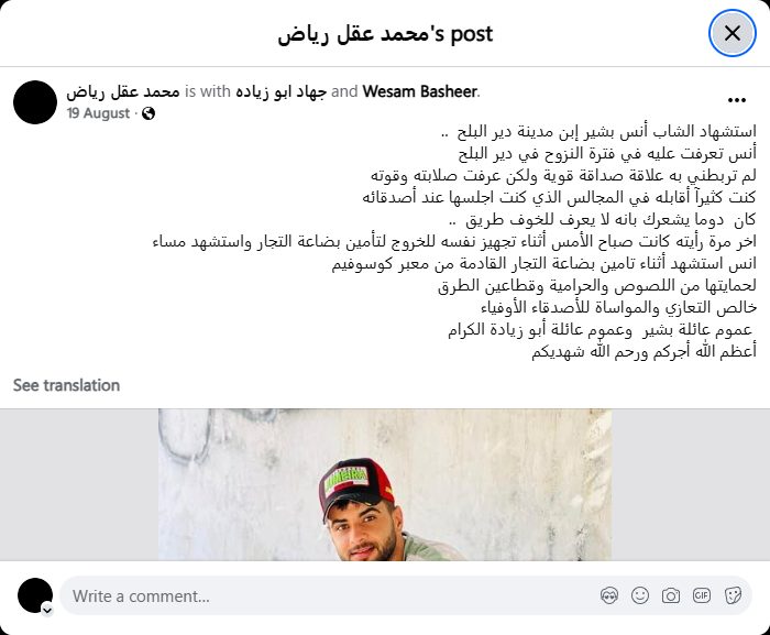 انس استشهد أثناء تامين بضاعة التجار القادمة من معبر كوسوفيم