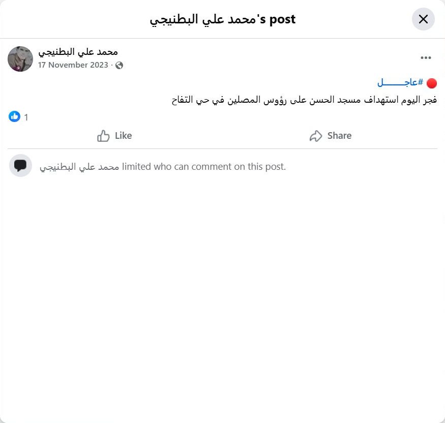 This morning, Al-Hassan Mosque was targeted while worshippers were inside in the Al-Tuffah neighborhood.
