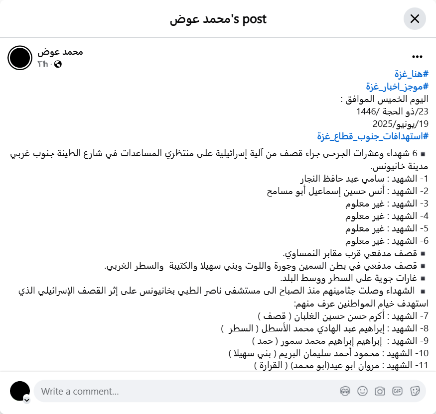 Two martyrs and a number of wounded in an Israeli bombing of a group of citizens in the vicinity of Al-Saniya roundabout in the center of Khan Yunis. 18- Martyr: Muhammad Hani Shurab. 19- Martyr: Musa Al-Haddad.