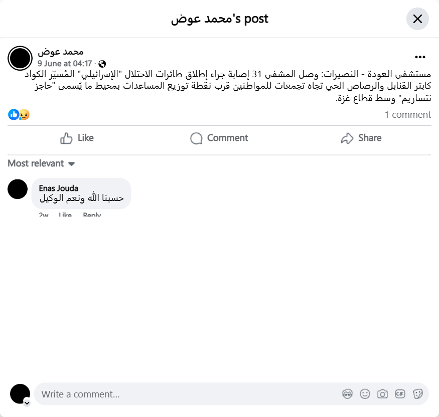 مستشفى العودة - النصيرات: وصل المشفى 31 إصابة جراء إطلاق طائرات الاحتلال "الإسرائيلي" المُسيّر الكواد كابتر القنابل والرصاص الحي تجاه تجمعات للمواطنين قرب نقطة توزيع المساعدات بمحيط ما يُسمى "حاجز نتساريم" وسط قطاع غزة.
