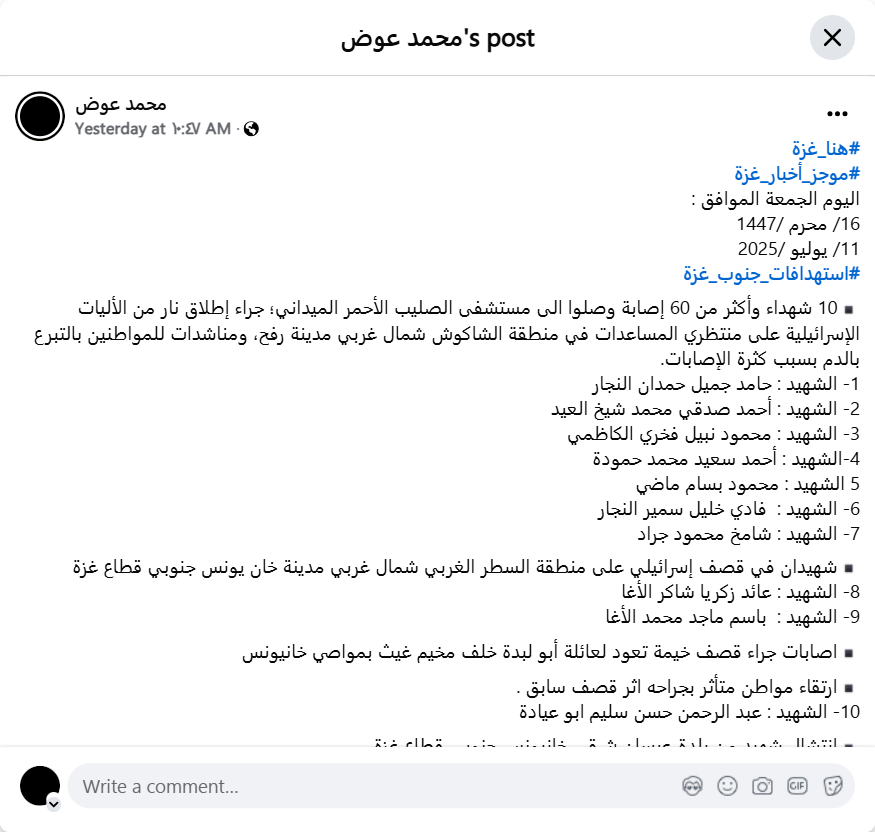 10 martyrs in Khan Yunis city after targeting a tent sheltering displaced people 27- Martyr: Hussam Ahmed Abu Rida (father) 28- Martyr: Mohammed Hussam Abu Rida (son) 29- Martyr: Lubna Abu Rida (Mohammed's wife) 30- Martyr: Ahmed Mohammed Hussam Abu Rida 31- Martyr: Subi Ibrahim Mohammed Abu Rida (newborn) 32- Martyr: Tala Mohammed Hussam Abu Rida 33- Martyr: Jude Mohammed Hussam Abu Rida 34- Martyr: Moaz Mohammed Hussam Abu Rida 35- Martyr: Imad Mansour (freed prisoner) 36- Martyr: Iyad Mohammed Hassan Abu Rida (freed prisoner)