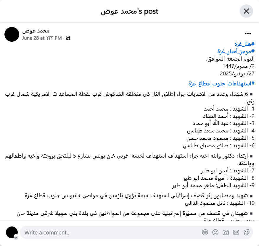 Archive URL: https://airwars.org/source/www-facebook-com-%d9%85%d8%ad%d9%85%d8%af-%d8%b9%d9%88%d8%b6-pfbid0s6gsfbcdyyerazv8znbcqjg8s1pdwyzm9qtwrknh5rcjxj9zqtzebjtyftm1vqrql-2025-06-28-090000-17/