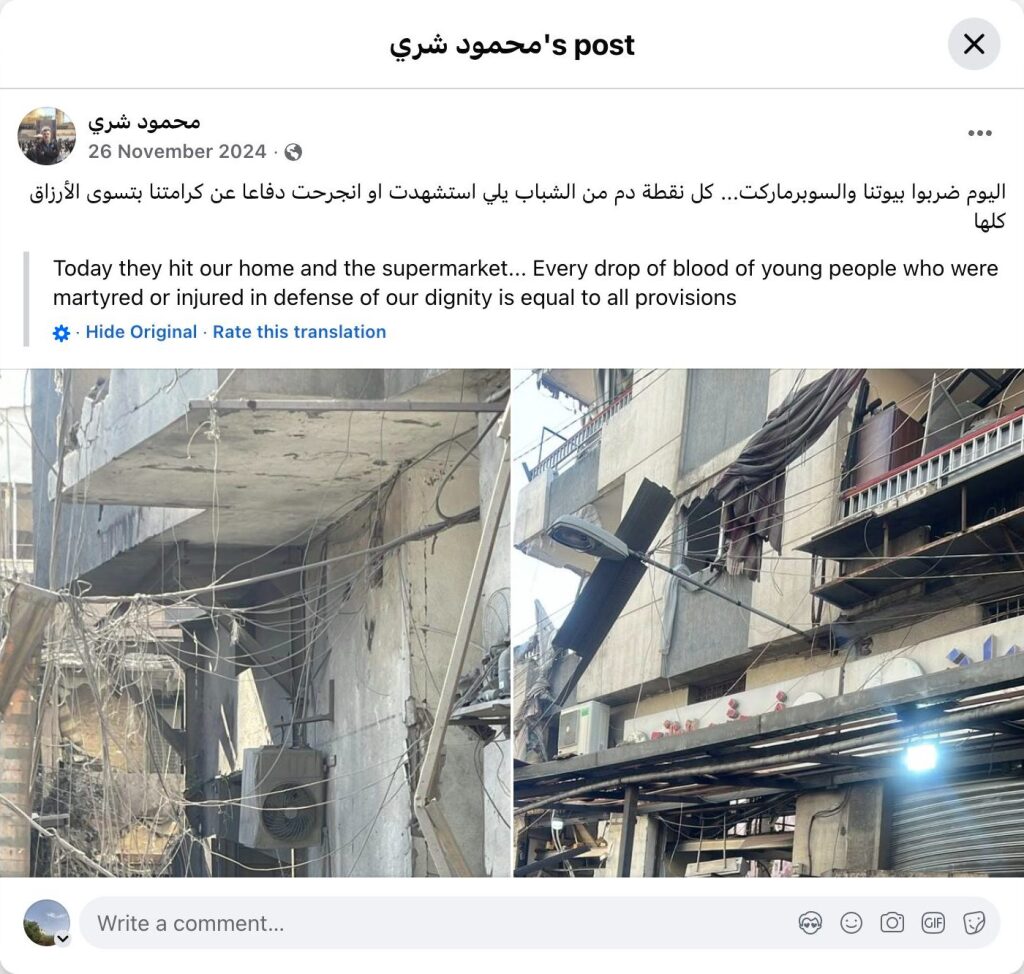 Today they bombed our homes and the supermarket... Every drop of blood shed by the young people who were martyred or wounded defending our dignity is worth more than all the provisions.