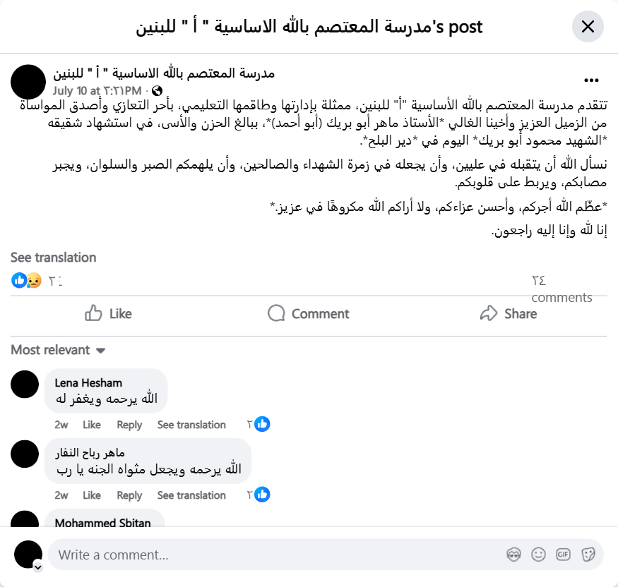 Al-Mu'tasim Billah Elementary School "A" for Boys, represented by its administration and teaching staff, offers its deepest condolences and sincere sympathy to our dear colleague and brother, *Professor Maher Abu Breik (Abu Ahmed),* with deep sorrow and grief, on the martyrdom of his brother, *Martyr Mahmoud Abu Breik*, today in *Deir al-Balah*.
