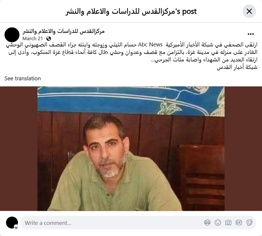 ABC News journalist Hossam al-Titi, his wife, and his daughter were killed in the brutal, treacherous Israeli bombing of his home in Gaza City. This coincided with a brutal bombardment and aggression that extended throughout the stricken Gaza Strip, resulting in the deaths of several martyrs and hundreds of wounded.
