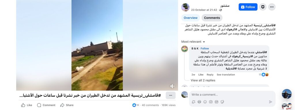 #Qamishli_Tirbesiya The scene from the air intervention, from the news we published hours ago about the clashes between the Asayish and the residents of #Karhok, led to the death of Mahmoud Halil Al-Shaher Al-Shammari and the wounding of his two sons, Ali and Alaa, and a number of Asayish members.