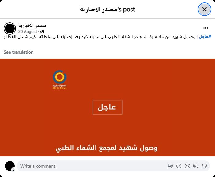 #Urgent | A martyr from the Bakr family arrives at Al-Shifa Medical Complex in Gaza City after being injured in the Zikim area in the northern Gaza Strip.