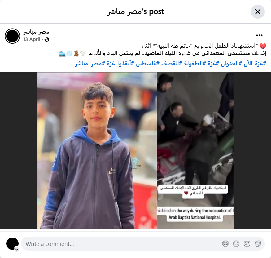 *The wounded child "Hatim Taha Al-Nabi" was martyred* during the evacuation of the Baptist Hospital in Gaza last night.. He could not bear the cold and pain #Gaza_Now #Aggression #Gaza #Childhood #Bombing #Palestine #Save_Gaza #Egypt_Live