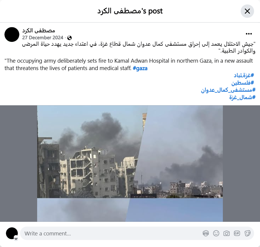 "جيش الاحتلال يعمد إلى إحراق مستشفى كمال عدوان شمال قطاع غزة، في اعتداء جديد يهدد حياة المرضى والكوادر الطبية.""The occupying army deliberately sets fire to Kamal Adwan Hospital in northern Gaza, in a new assault that threatens the lives of patients and medical staff. #gaza #غزةـتباد #فلسطين#مستشفى_كمال_عدوان#شمال_غزة