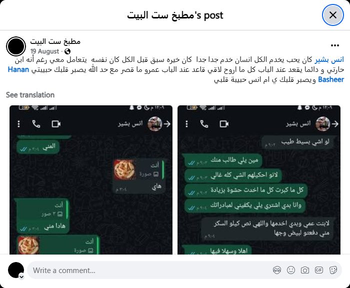 Anas Basheer loved to serve everyone. He was a very helpful person. His kindness came before everyone else. He wanted to deal with me even though he was from my neighborhood. He always sat by the door. Every time I went, I found him sitting by the door. He never neglected anyone. May God give patience to your heart, my love Hanan Basheer, and may He give patience to your heart, O mother of Anas, the love of my heart.