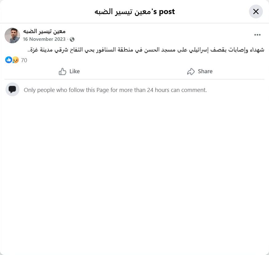 Martyrs and injuries in an Israeli bombing of Al-Hassan Mosque in the Al-Sanafour area of Al-Tuffah neighborhood, east of Gaza City.