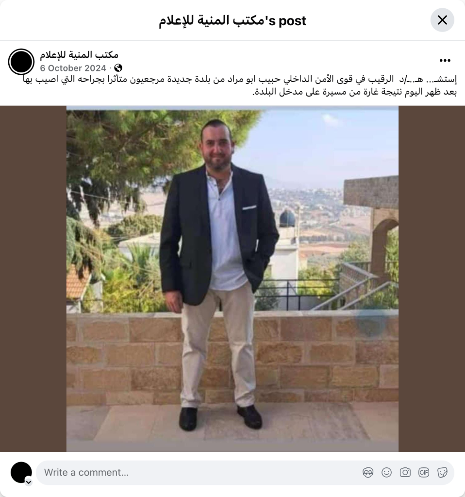 Internal Security Forces Sergeant Habib Abu Murad from Jdeidet Marjeyoun was martyred after succumbing to his wounds this afternoon as a result of a drone strike on the entrance to the town.