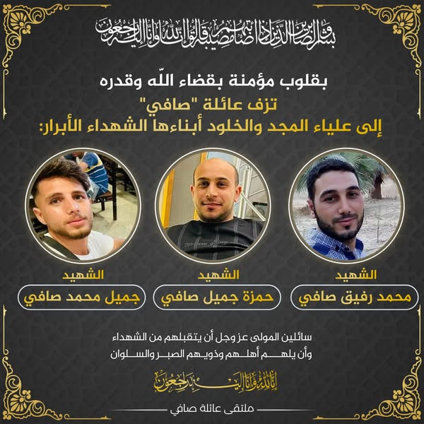 God Almighty said: “And give good tidings to the patient, who, when disaster strikes them, say, “Indeed we belong to God, and indeed to Him we will return.” With hearts that believe in God’s will and destiny, and crowned with pride and acceptance, the “Safi” family announces to the highest levels of glory and eternity its righteous martyred sons: Martyr Muhammad Rafiq Safi Martyr Hamza Jamil Safi Martyr Jamil Muhammad Safi We ask God Almighty to accept them among the martyrs and to inspire their families and relatives with patience and solace - “Indeed we belong to God, and indeed to Him we will return” #Safi_Family_Forum May 13, 2025 AD | 15 Dhu al-Qi’dah 1446 AH