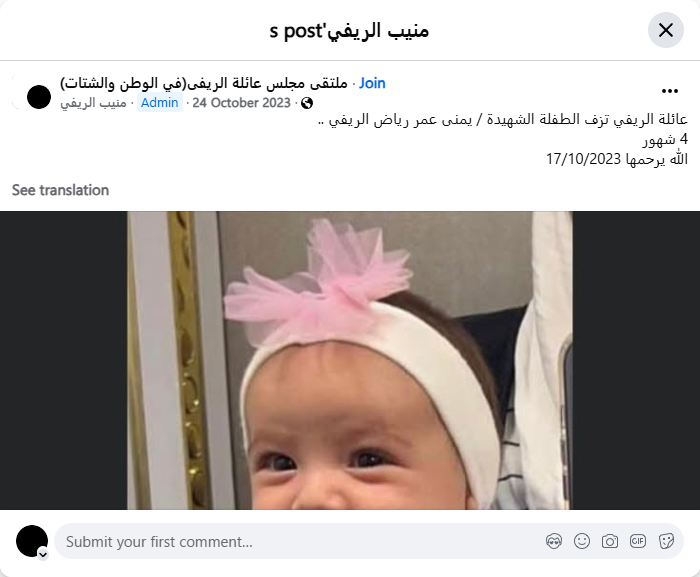 The Al-Rifai family mourns the martyred child / Yumna Omar Riyad Al-Rifai.. 4 months old. May God have mercy on her. 10/17/2023