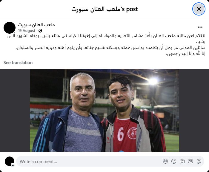 نتقدّم نحن عائلة ملعب العنان بأحرّ مشاعر التعزية والمواساة إلى إخوتنا الكرام في عائلة بشير، بوفاة الشهيد أنس بشير.