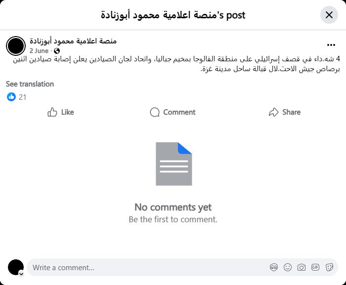 The Fishermen's Committees Union announces that two fishermen were injured by Israeli occupation forces' bullets off the coast of Gaza City.