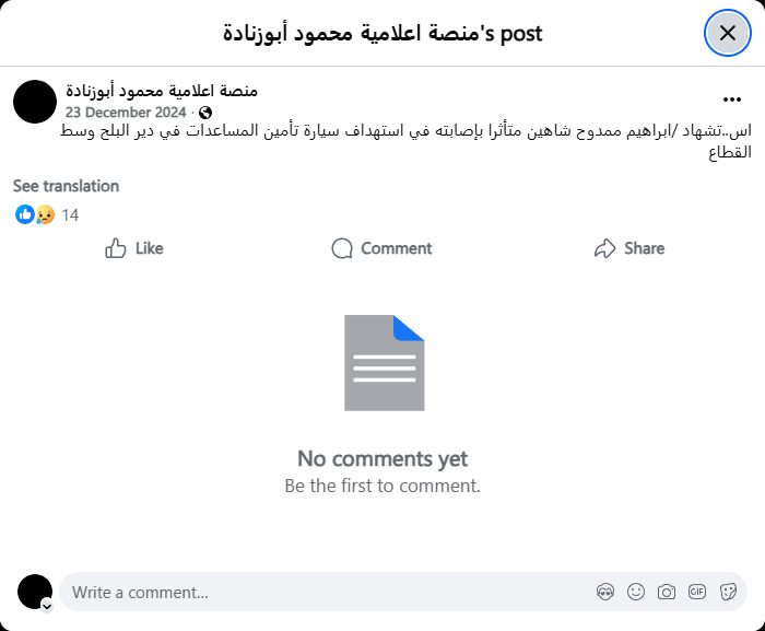 Ibrahim Mamdouh Shaheen was martyred after being injured in the targeting of an aid vehicle in Deir al-Balah, central Gaza Strip.