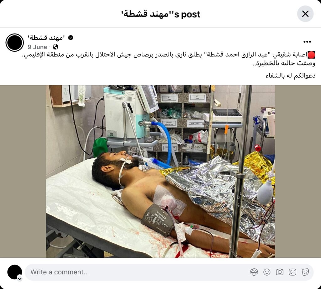 My brother, Abdul Razzaq Ahmed Qishta, was shot in the chest by the Israeli occupation forces near the Al-Iqlimiya area. His condition is described as critical. Please pray for his speedy recovery.