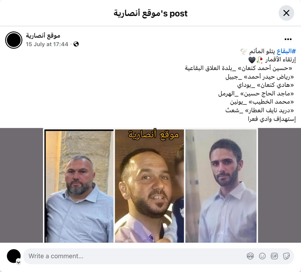 #Bekaa The funeral follows the ascension of the moons "Hussein Ahmed Kanaan" _Alaq town in the Bekaa "Riyad Haidar Ahmed" _Byblos "Hadi Kanaan" _Budai "Majed Al-Hajj Hussein" _Hermel "Mohammad Al-Khatib" _Younin "Dureid Nayef Al-Attar" _Shaath was martyred in Wadi Fara