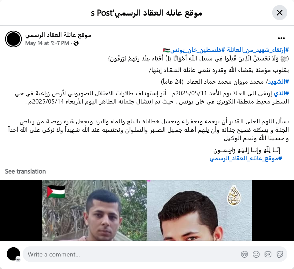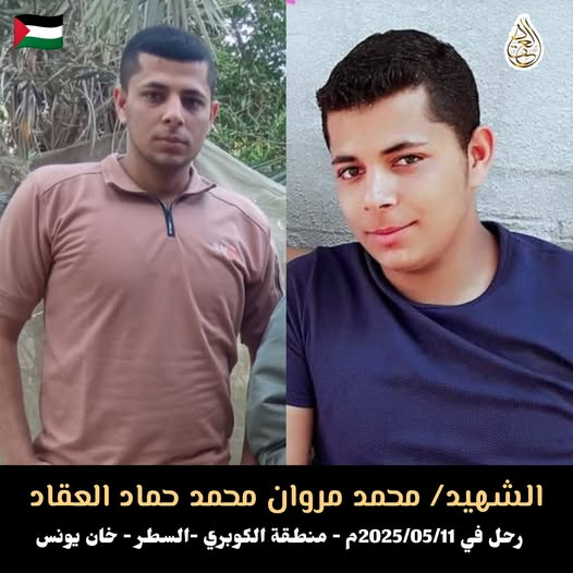 A martyr from the family ascends #Palestine_Khan_Younis (﷽ And never think that those who were killed in the cause of Allah are dead. Rather, they are alive with their Lord, and they are provided for.) With hearts that believe in Allah’s will and destiny, the Al-Aqqad family mourns its son, #the_martyr/ Muhammad Marwan Muhammad Hammad Al-Aqqad (24 years old), who ascended to heaven on Sunday 05/11/2025 AD, as a result of the Zionist occupation aircraft targeting agricultural land in the Al-Satar neighborhood, around the Al-Kobri area in Khan Yunis, where his pure body was recovered today, Wednesday 05/14/2025 AD. _____ We ask God Almighty to have mercy on him, forgive him, and wash away his sins with snow, water, and hail, and make his grave A garden of the gardens of Paradise and may He grant him a spacious place in Paradise and inspire his family with beautiful patience and solace. We consider him a martyr with God and we do not vouch for anyone before God. God is sufficient for us, and He is the best Disposer of affairs. Indeed, we belong to God and to Him we shall return.