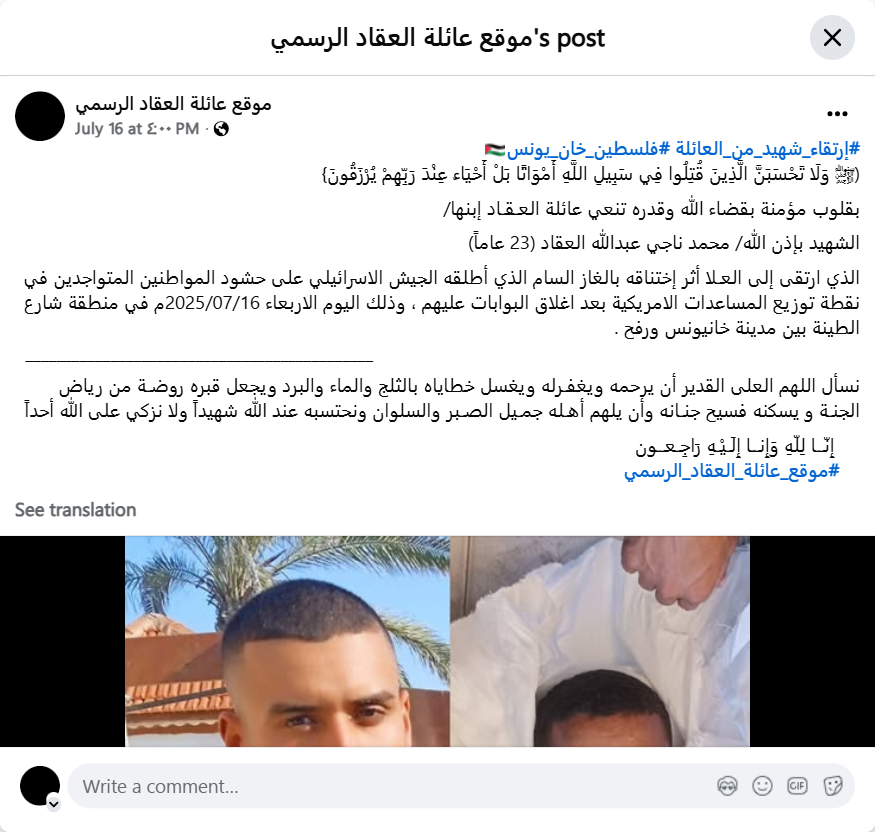 الذي ارتقى إلى العـلا أثر إختناقه بالغاز السام الذي أطلقه الجيش الاسرائيلي على حشود المواطنين المتواجدين في نقطة توزيع المساعدات الامريكية بعد اغلاق البوابات عليهم ، وذلك اليوم الاربعاء 2025/07/16م في منطقة شارع الطينة بين مدينة خانيونس ورفح .