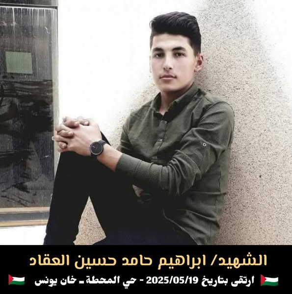 #إرتقاء_شهيد_من_العائلة #فلسطين_خان_يونس(﷽ وَلَا تَحْسَبَنَّ الَّذِينَ قُتِلُوا فِي سَبِيلِ اللَّهِ أَمْوَاتًا بَلْ أَحْيَاءٌ عِنْدَ رَبِّهِمْ يُرْزَقُونَ}بقلوب مؤمنة بقضاء الله وقدره تنعي عائلة العـقـاد إبنها/ #الشهيد/إبراهيم حامد حسين العقاد (26 عاماً)#الذي إرتقى الى العـلا صباح هذا اليوم الاثنين 2025/05/19 ، برصاص جيش الاحتلال الصهيوني بجوار منزله، خلال تنفيذ القوة الصهيونية الخاصة مداهمة إستهدفت منزل جيرانهم عائلة سرحان وسط شارع المتحف (الارنب) في حي المحطة بخان يونس .نسأل اللهم العلى القدير أن يرحمه ويغفـرله ويغسل خطاياه بالثلج والماء والبرد ويجعل قبره روضـة من رياض الجنـة و يسكنه فسيح جنـانه وأن يلهم أهـله جمـيل الصـبر والسلوان ونحتسبه عند الله شهيداً ولا نزكي على الله أحداً و حسـبنا الله ونعـم الوكـيل إِنّــَا لِلّهِ وَإِنــَّا إِلَـيْـهِ رَاجِـعــون #موقع_عائلة_العقاد_الرسمي