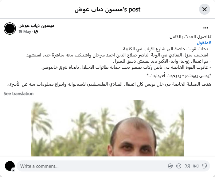 Full event details #copied - Special forces entered Rabbit Street in the battalion - They stormed the home of the leader in the Nasser Brigades, Salah al-Din Ahmed Sarhan, and clashed with him directly until he was martyred - His wife and eldest son were arrested after a thorough search of the house - The special force left in a small passenger bus under the protection of occupation aircraft towards the east of Khan Yunis *Yossi Yehoshua - Yedioth Ahronoth: * The goal of the special operation in Khan Yunis was to arrest the Palestinian leader for interrogation and to extract information from him about the prisoners.