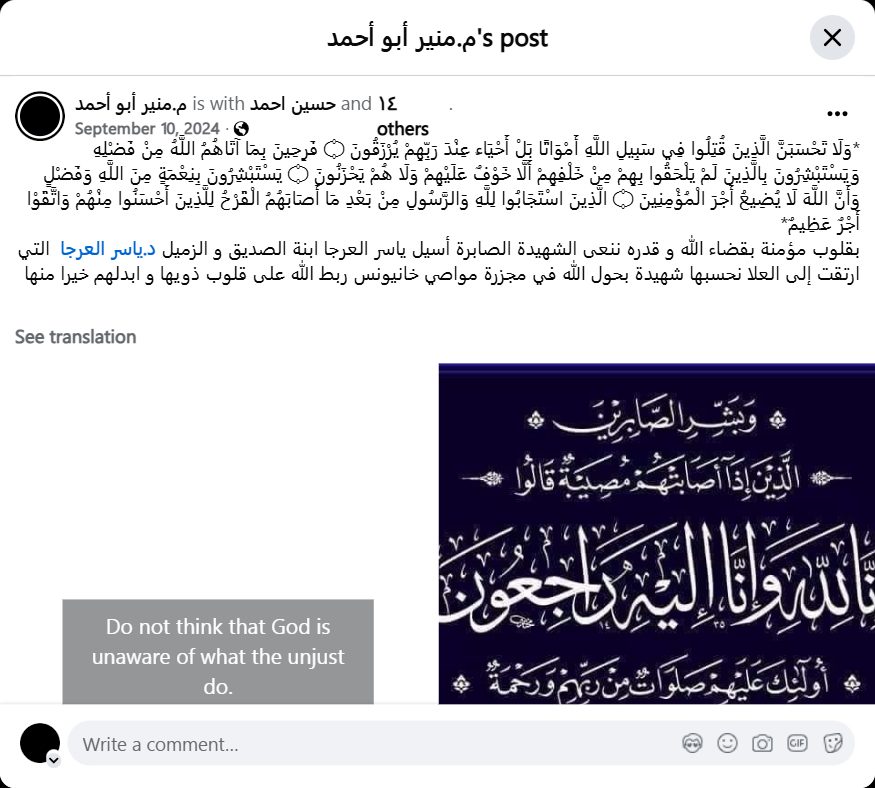 With hearts that believe in Allah's will and destiny, we mourn the steadfast martyr Aseel Yasser Al-Arja, daughter of our friend and colleague Dr. Yasser Al-Arja, who ascended to the highest ranks. We consider her a martyr, by Allah's will, in the Mawasi Khan Yunis massacre. May Allah comfort the hearts of her family and replace her with someone better.
