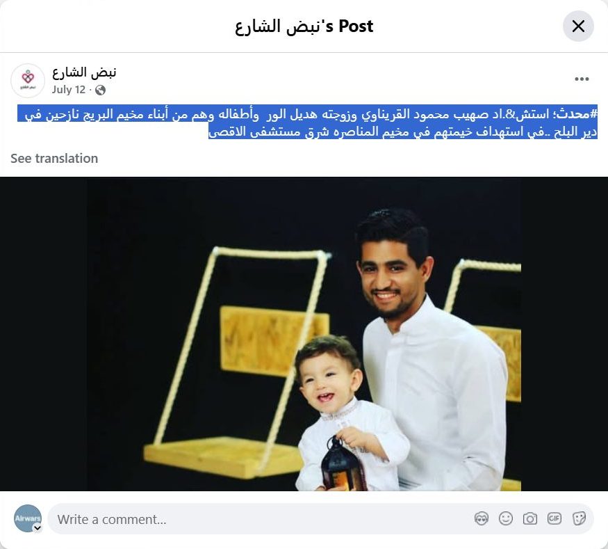 #Updated; Suhaib Mahmoud Al-Qarinawi, his wife Hadeel Al-War, and their children, originally from Al-Bureij camp and displaced in Deir al-Balah, were martyred when their tent in Al-Manasra camp, east of Al-Aqsa Hospital, was targeted.