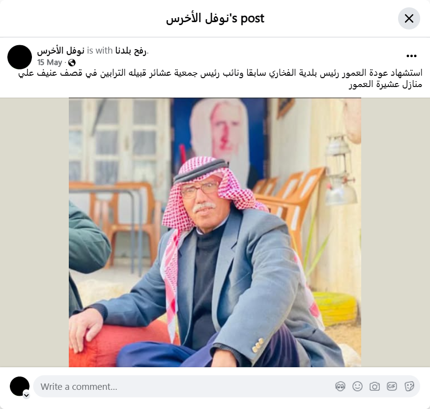 استشهاد عودة العمور رئيس بلدية الفخاري سابقا ونائب رئيس جمعية عشائر قبيله الترابين في قصف عنيف علي منازل عشيرة العمور